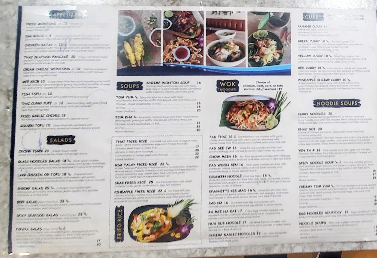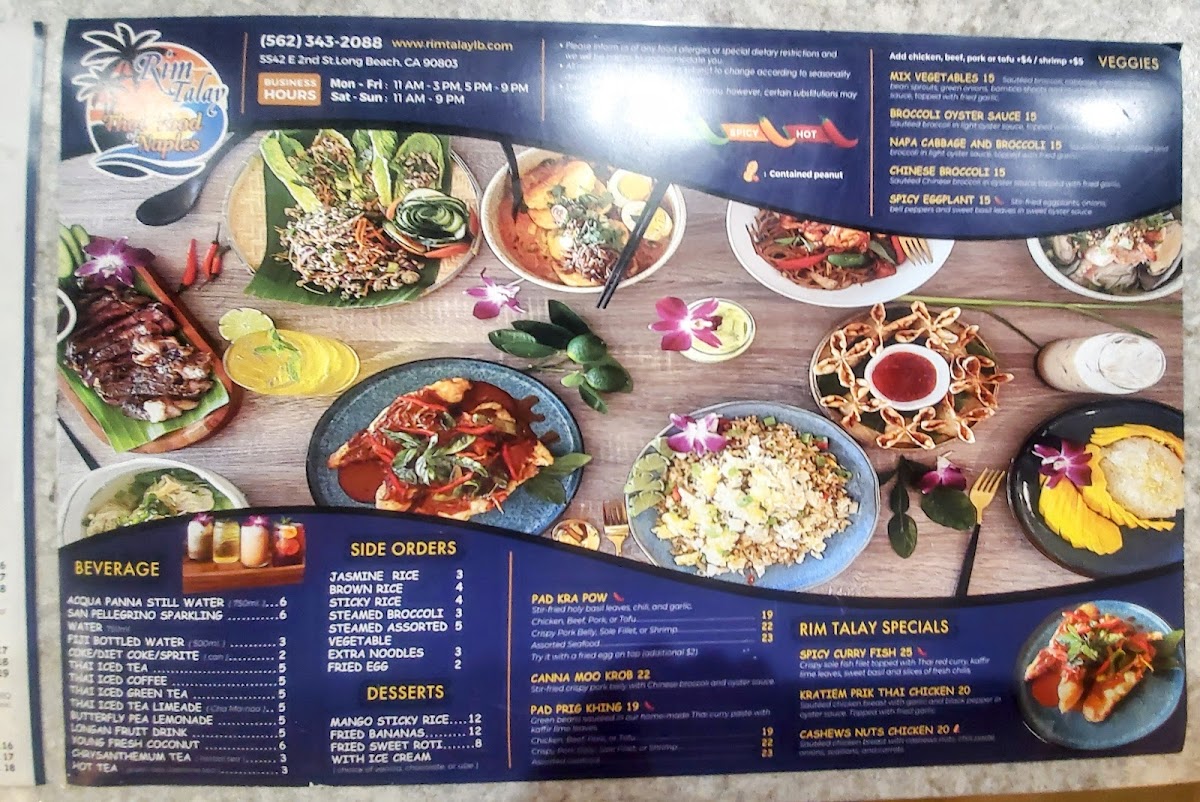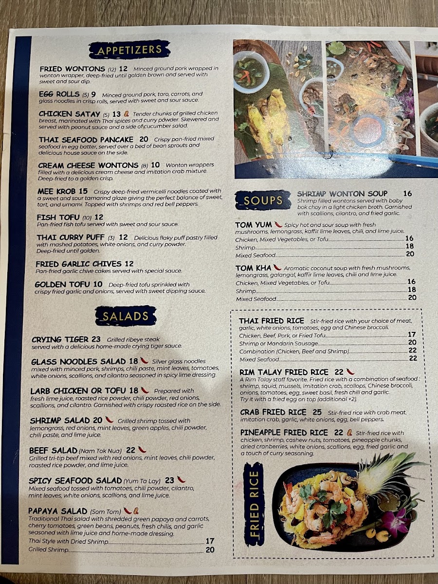 A rim Talay staff favorite. Fried rice with a combination of seafood, shrimp, squid, mussels, imitation crab, scallops, Chinese broccoli, onions, tomatoes, egg, sweet basil, fresh chili and garlic. Hot spicy.